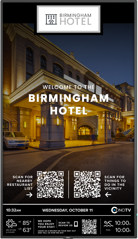 For hotels, ConciTV transforms the guest experience by providing a curated guide to the hotel brand, local attractions, dining, and events. Guests enjoy an enriched stay, while hotels benefit from increased guest satisfaction and loyalty.
